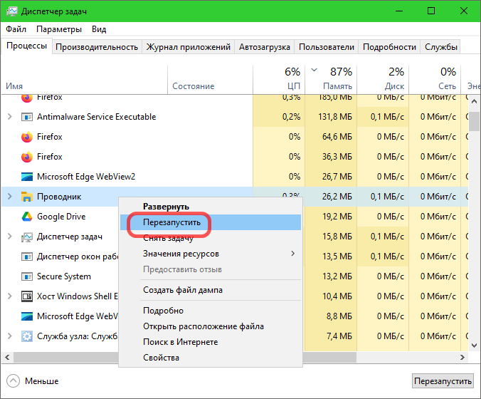 Начните с самого простого — открой «Диспетчер задач», найдите в списке «Проводник», кликните по нему ПКМ и выберите «Перезапустить».
