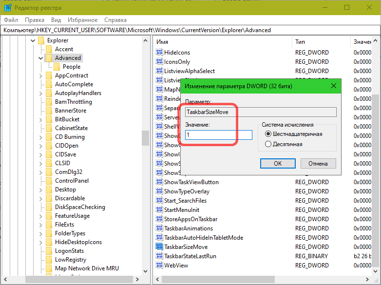 И измените значение DWORD-параметра TaskbarSizeMove на 1. Если он отсутствует, создайте его.