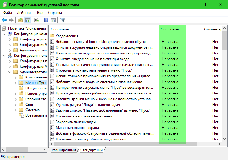 Все политики этого раздела должны иметь статус «Не задана».