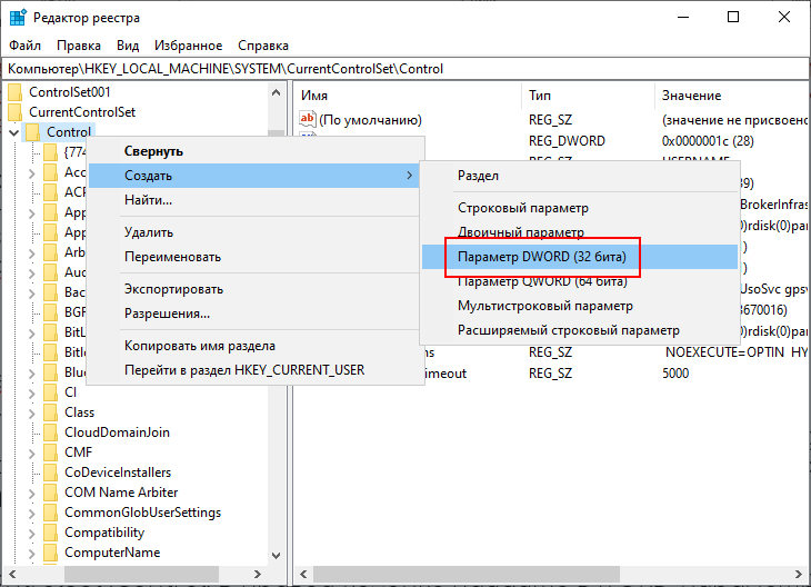 В некоторых случаях параметр может отсутствовать, – создайте его из контекстного меню подраздела Control.