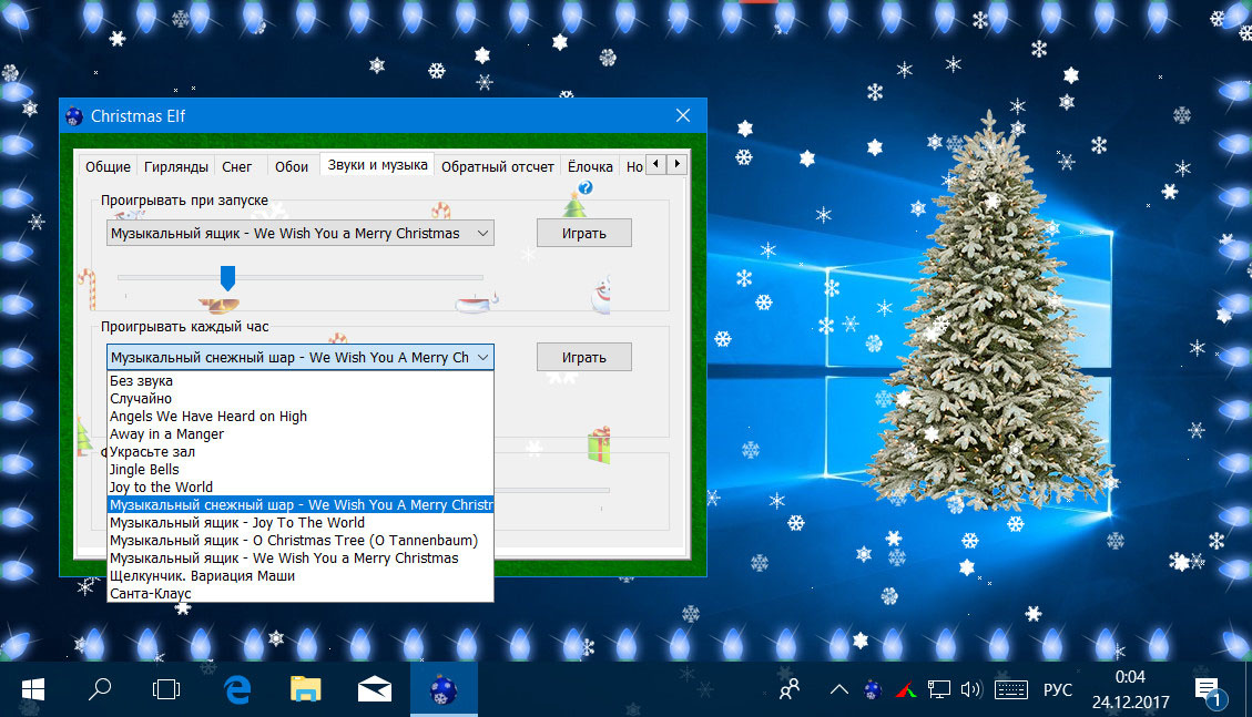 При желании на экран Windows добавляется снег. В настройках Christmas Elf его можно сделать мелким, плотным, пушистым, пореже или погуще, более или менее интенсивным, а также выбрать силу ветра. Ёлочка по центру экрана включается, отключается, доступно 5 её дизайнов. Christmas Elf также предусматривает звуковое оформление. Для ежечасного проигрывания можно выбрать короткие новогодние и рождественские мелодии из предлагаемого перечня. А для постоянного фонового проигрывания доступны шум метели и треск камина.