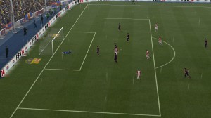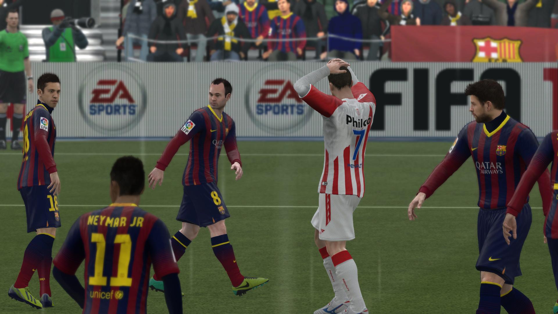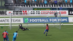По сравнению с предыдущей частью игры анимация ударов (Pure Shot) стала более естественной, теперь бег футболиста плавно перетекает в замах и последующий удар, составляя единое движение тела. Однако и тут ещё есть над чем поработать, так как направление удара и полёта мяча всё ещё привязано к направлению бега спортсмена, хотя мы с вами прекрасно понимаем, что в реальной жизни всё происходит несколько иначе. Форвард может бежать параллельно линии ворот, а потом внезапно развернуться и нанести удар в нижний угол, тем самым пытаясь поймать голкипера на противоходе, а не бить в ту сторону, в которую бежал. Наносить удары по воротам в FIFA 14 легко и трудно одновременно. Лёгкость вызвана тем, что мяч всегда будет лететь в сторону движения спортсмена, а высота и сила удара футболиста по мячу регулируется временем, в течение которого вы держите кнопку удара. Сложность же заключена в том, что практически невозможно направить мяч в определённый сектор ворот, а их центр практически всегда остаётся «на замке».