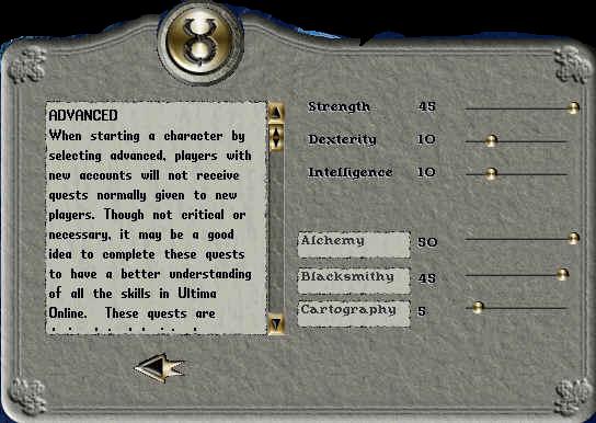 Появляясь в мире Ultima Online в городке Britain ваш персонаж не имеет практически не каких умений кроме базовых. Также у него отсутствуют характеристики кроме тех, которые вы задали при создании персонажа. Так же самое интересное в этой игре напрочь, отсутствуют очки опыта. Ваши характеристики персонажа повышаются, когда вы что-то делаете, ну например, деретесь с противником - тогда у вас повышается сила. Так же сделаны и умения при попытки, например, сделать меч или броню у вас будет повышаться умения создавать предметы и т.д.Плюс у вас отсутствует, броня и какое либо оружие. Кроме базовых предметов, дающихся от выбора умения. И небольшая горстка денег. С этими атрибутами вам и предстоит начинать сражения в этом мире.