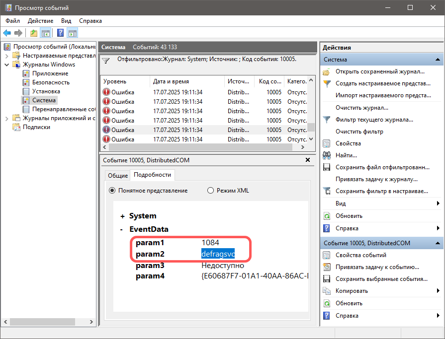 Когда возникает такая ошибка, в Журнале событий, в разделе «Система», автоматически создается запись с кодом события 10005. Если посмотреть сведения об ошибке на вкладке «Подробности», будет указано имя службы, которая ее вызвала — службы, которая не может быть запущена в безопасном режиме.