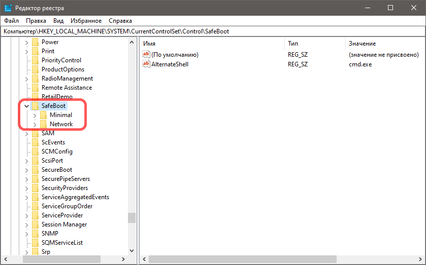Первый содержит записи служб и драйверов Safe Mode по умолчанию, второй — Safe Mode с поддержкой сети.