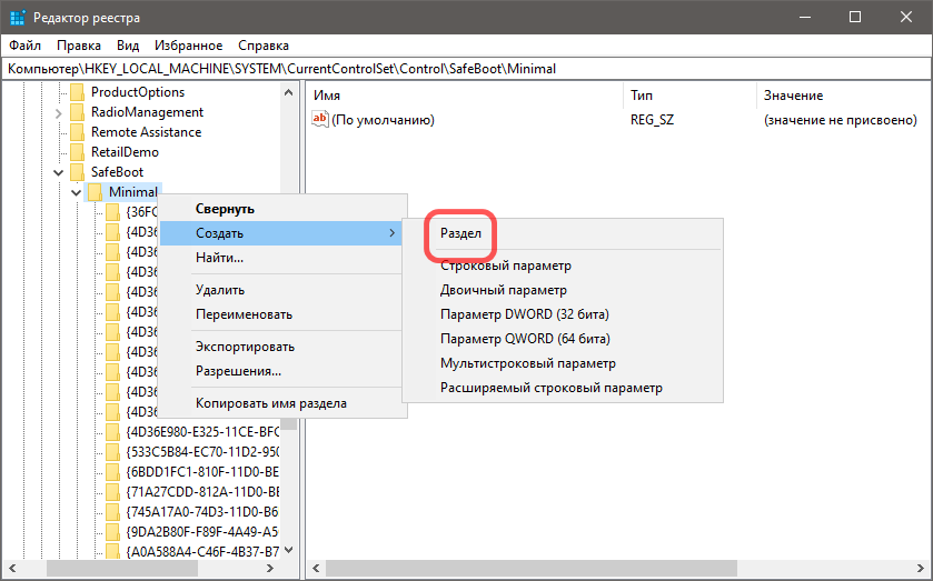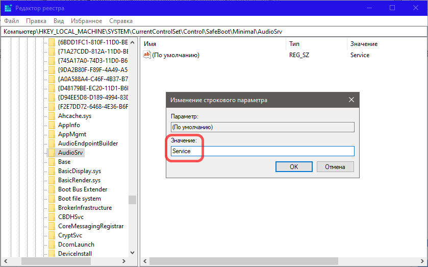В разделе Minimal создайте новый подраздел с именем Audiosrv.