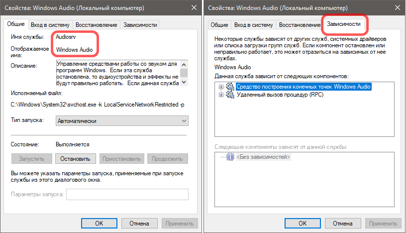 Например, та же Windows Audio зависит от служб «Средство построения конечных точек» и «Удаленный вызов процедур».