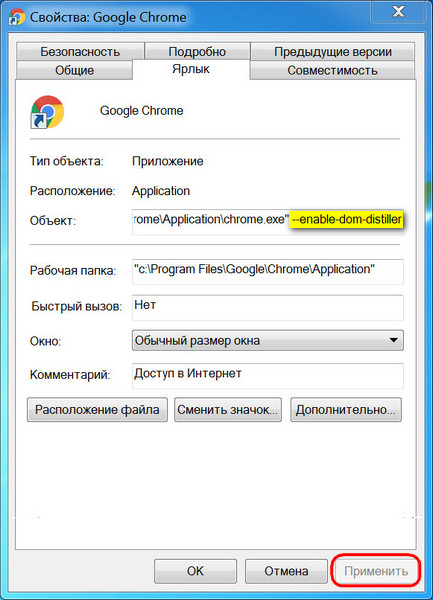 Возможность активации в Google Chrome штатного режима чтения предусматривается уже давно, но доводить до ума его создатели браузера почему-то не спешат. Чтобы его активировать, необходимо в свойствах ярлыка запуска браузера, в графе «Объект» через пробел после последнего знака кавычек внести значение: