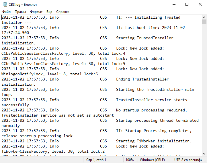 Файл CBS.log представляет собой отдельный журнал в папке %windir%\Logs\CBS, содержащий сведения об установленных и/или удаленных обновлениях Windows, кроме того, он содержит сведения об ошибках интерактивного и автономного обслуживания средствами sfc и dism.