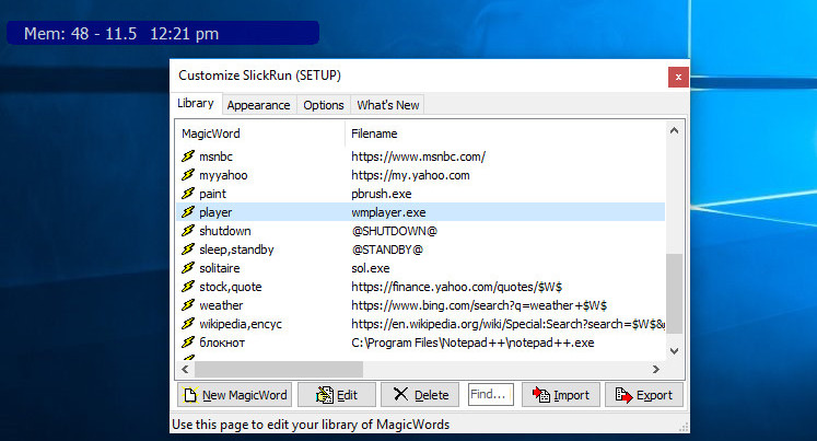 Например, ключевое слово «dos» откроет командную строку, если же вы выполните команду «google», откроется маленькое окошко с предложением ввести поисковый запрос, который будет затем перенаправлен в браузер по умолчанию. За создание новых алиасов в программе отвечает опция «New MagicWord». Она открывает окошко, в котором на вкладке «Library» можно указать путь к запускаемому объекту и добавить сам алиас.