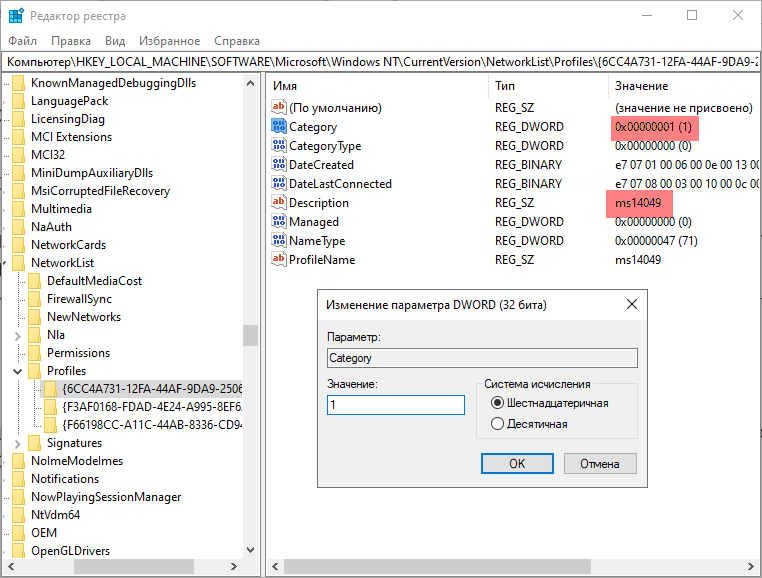 Находим свое подключение по значению параметра Description и изменяем значение параметра Category.