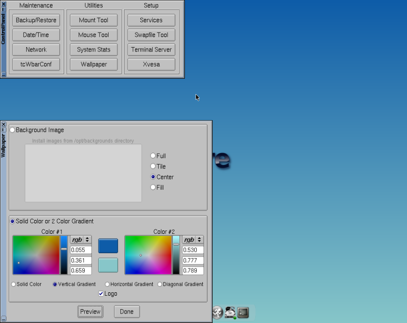 - TinyCore - версия с графической средой на базе FLTK и FLWM, предназначенная для запуска в режиме LiveCD.