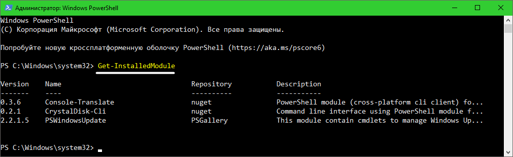 Для получения списка установленных модулей PowerShell используется команда: