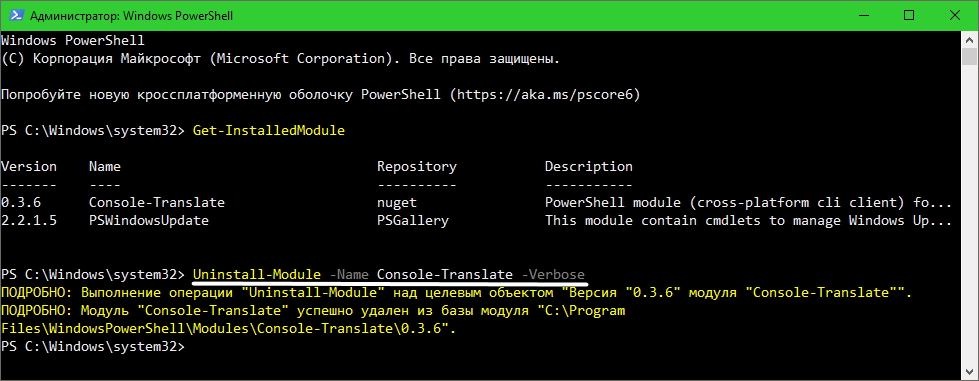 По умолчанию PowerShell в Windows поставляется с базовым набором функций — но его возможности легко расширить с помощью модулей из официальных или сторонних репозиториев. Например, установив модуль PSWindowsUpdate, можно прямо из консоли управлять обновлениями Windows. Модуль Azure позволит работать с облачными сервисами Microsoft Azure, не открывая веб-портал в браузере, а Console-Translate — переводить текст с одного языка на другой.