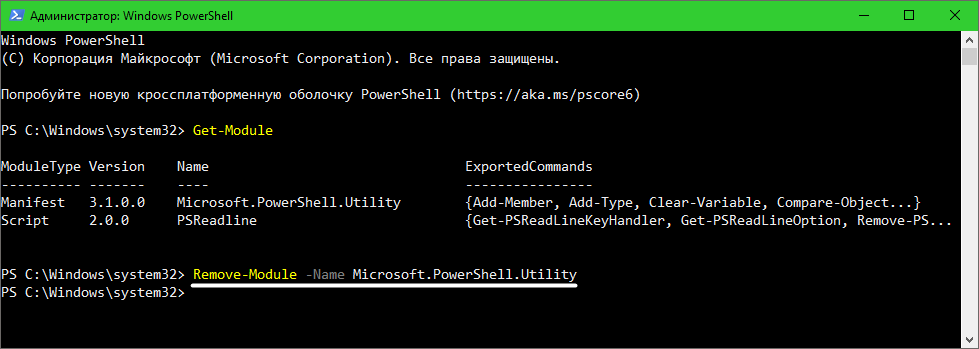 Чтобы проверить, какие модули загружены, используйте команду Get-Module, а чтобы выгрузить нужный модуль — Remove-Module -Name NAME.