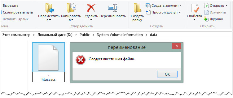 Чтобы продемонстрировать новую возможность «десятки», создадим на рабочем столе файл .htaccess.