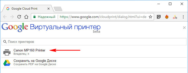 Появится перечень всех устройств, значащихся в операционной системе как принтеры. В нашем случае добавление принтера осуществляется в системе Windows, потому вместе с реальным МФУ Canon отображаются ещё и виртуальные технологии Microsoft. Они не нужны, снимаем их галочки и оставляем только реальный физический принтер. В нашем случае, как видим на скриншоте ниже, это Canon MP160. Чтобы в будущем все подключаемые к этому компьютеру принтеры автоматически подвязывались под данный аккаунт Google и могли быть использованы для удалённой печати по технологии виртуального принтера, можно выставить галочку автоматической регистрации принтеров. По итогу жмём «Добавить принтер».