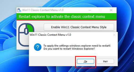 При этом синяя полоса с текстом «Win 11 default context menu style enabled» станет зеленой, а текст будет заменен на «Restart explorer to activate the classic context menu».