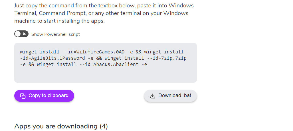 Решением может стать Winstall — бесплатный веб-сервис, позволяющий генерировать командные файлы для пакетной установки приложений через Windows Package Manager. Работает он по тому же принципу, что и сервис Ninite с той лишь разницей, что Ninite генерирует пакетные EXE-установщики с графическим интерфейсом, тогда как Winstall создает выполняемые в командной строке скрипты.
